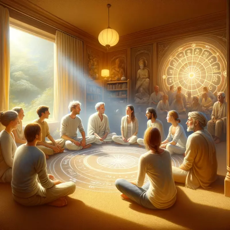 Each person in the group is engaging with the others in a manner that reflects mutual support and spiritual growth. Their expressions and body language radiate serenity, understanding, and a shared journey towards higher consciousness. This peaceful environment, resembling a space for spiritual learning and fellowship, enhances the sense of communal growth and guided development.