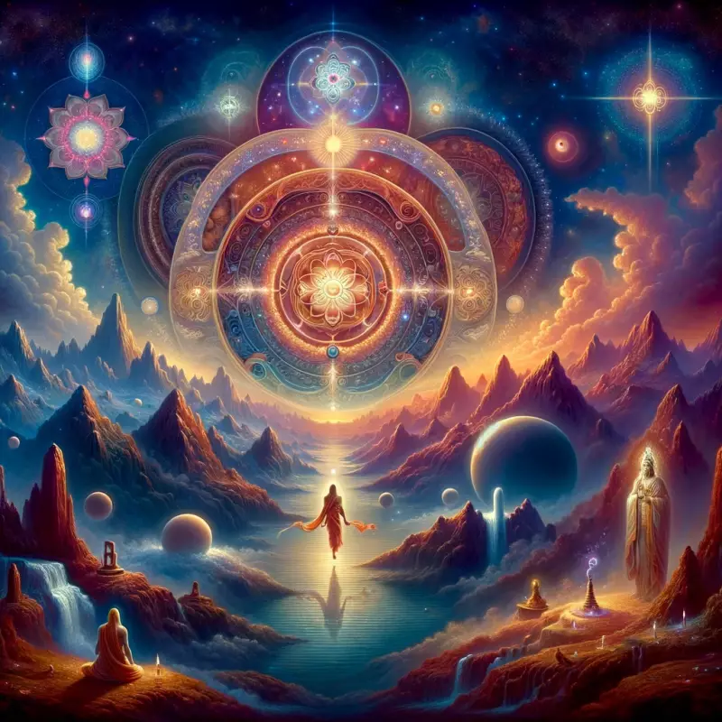 Here's an artwork depicting Brahma-loka, the absolute plane in spiritual cosmology. The scene represents Brahma-loka as a sublime and celestial realm, visualized as more ethereal and transcendent than the material world. It captures the essence of mahat, symbolizing truth and the absence of fear. Subtle visual cues suggest Brahma's role as the cosmic organizer, decreeing the laws of form. The artwork is designed to evoke a sense of sublime tranquility and profound spiritual insight, with ethereal landscapes and celestial motifs, embodying the place of fearlessness, truth, and insight, where one merges with the Absolute. Enjoy this representation of profound spiritual dimensions.